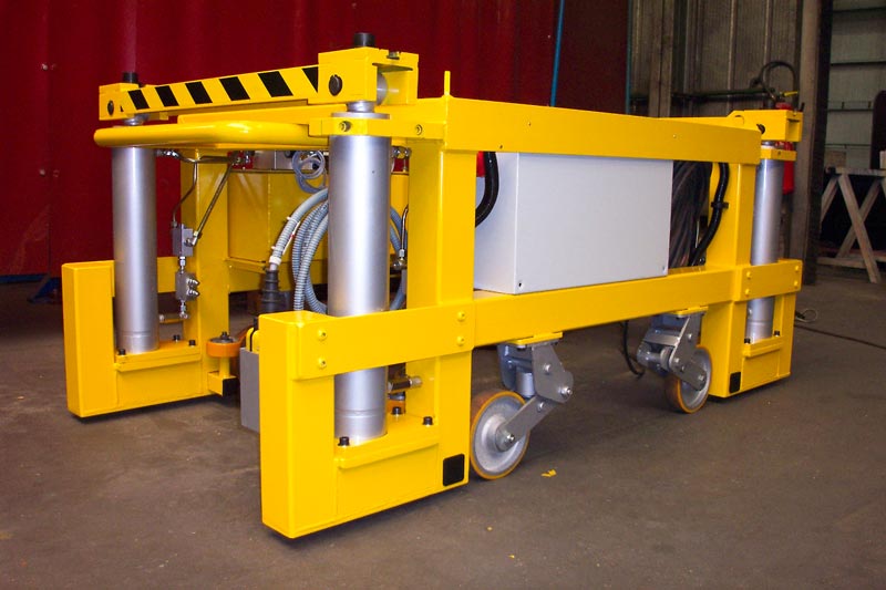 La carretilla elevadora de bogies funciona de forma electrohidráulica y el movimiento de elevación lo proporcionan 4 cilindros hidráulicos sincronizados.