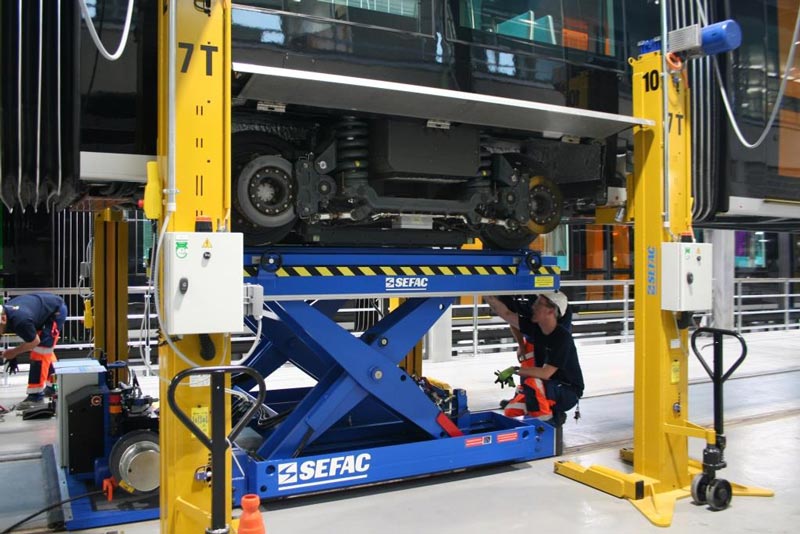 La plataforma de bogies se utiliza para desmontar/instalar un bogie de tranvía o tren elevado mediante columnas elevadoras. Está disponible en 2 capacidades: 6 toneladas y 8 toneladas. Nuestros dos modelos incorporan un recorte en forma de U que permite a los operarios acceder a la parte inferior del bogie durante su desmontaje o instalación.