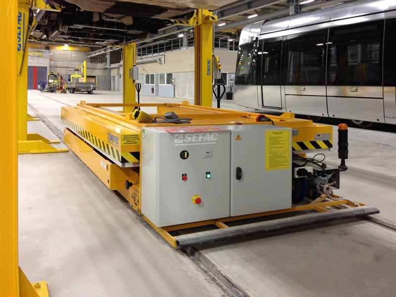 La table dépose bogie permet de déposer/poser un bogie d’un tramway ou d’un train levé par des colonnes élévatrices. Elle existe en 2 capacités : 6 tonnes et 8 tonnes. Nos 2 modèles comportent une découpe en forme de U permettant aux opérateurs d’accéder sous le bogie lors de la dépose ou pose. Vous référer au tableau technique pour plus de précisions.